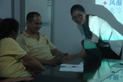 陳老師還現(xiàn)場向員工們傳授了穴位保健相關(guān)基礎(chǔ)知識和有效的預(yù)防及改善方法。通過真人模擬的方式,用電療儀等輔助治療器械幫助員工了解疏通穴位、測量血壓的操作方法。